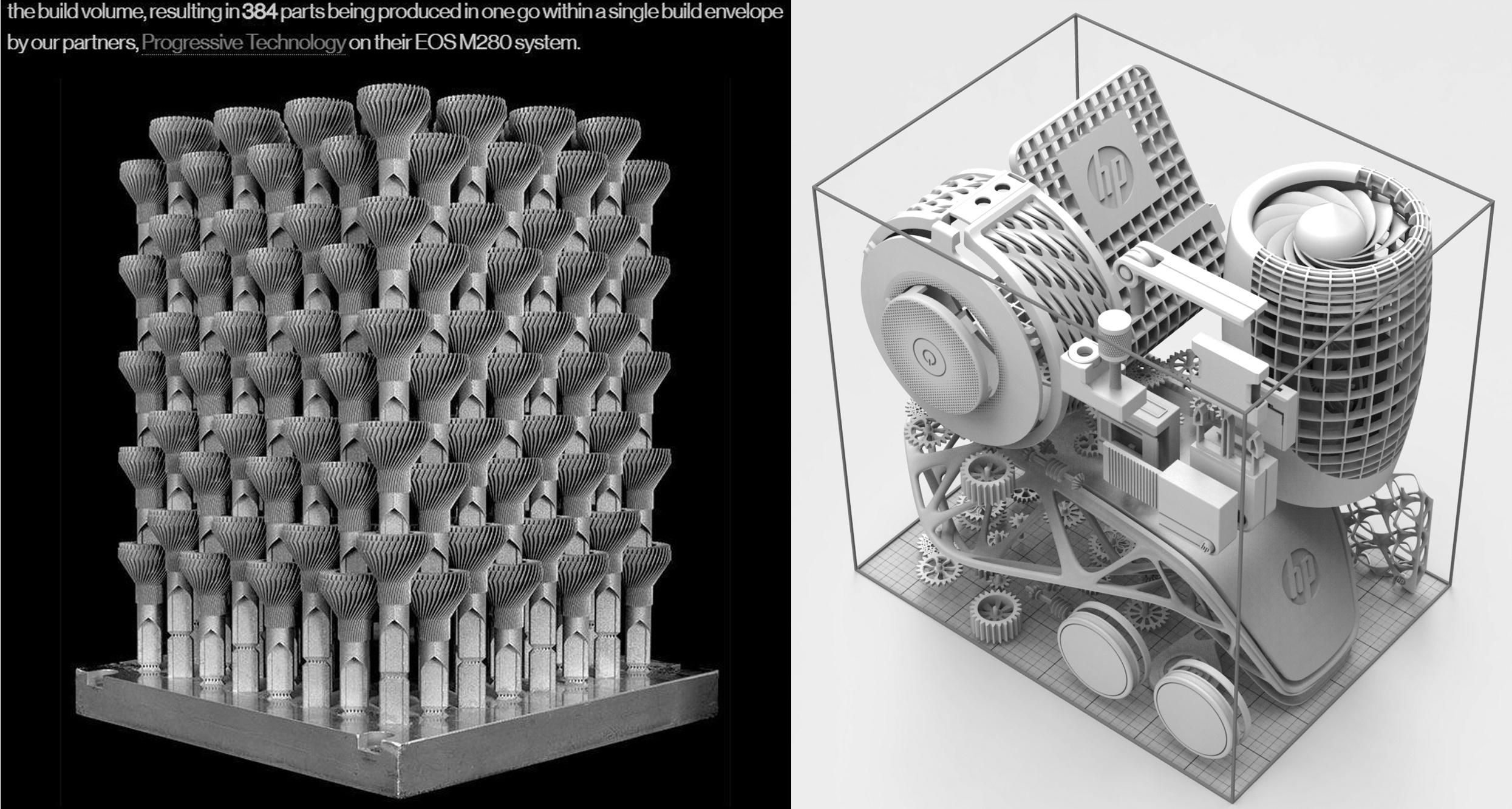 Abb.: Nesting at it’s best. Zwei schöne Beispiele für die Ausnutzung des Bauraums. Image Sources: links: 3D Metal Printing Magazine und Grafik rechts: HP (Software Smart Stream)